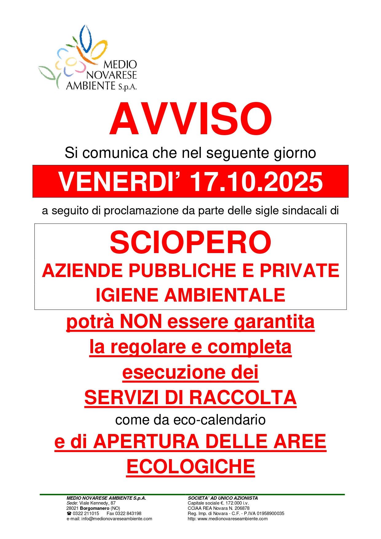 Si avvisa che venerdì 17 ottobre 2025 non verrà garantita l'apertura dell'area ecologica causa sciopero.
